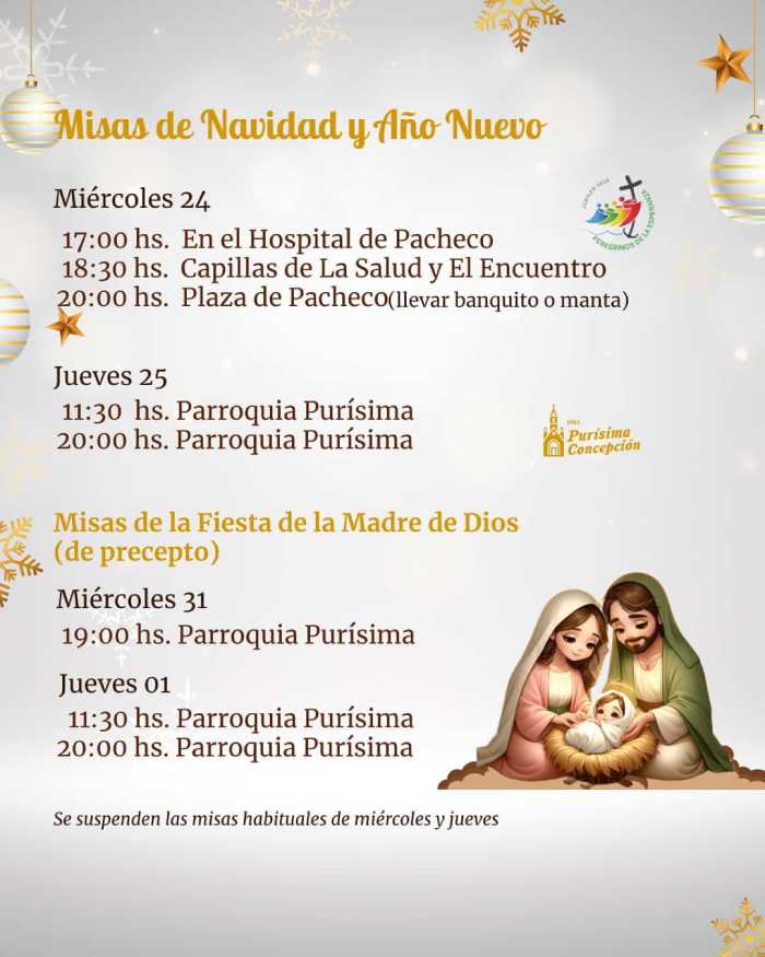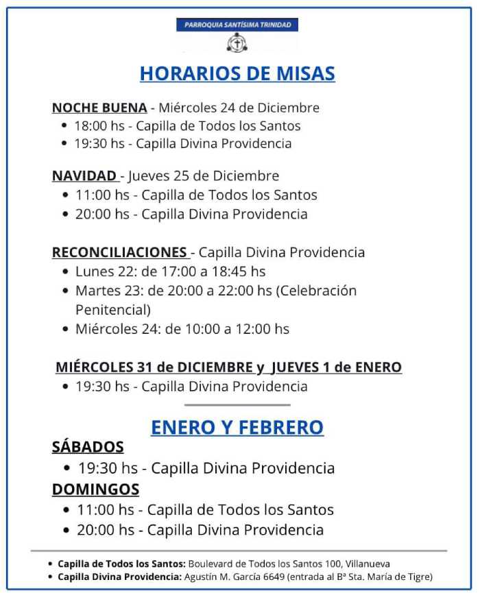 Como cada año, las parroquias y capillas locales ofrecerán celebraciones especiales para Nochebuena, Navidad, Fin de Año y Año Nuevo, en distintos horarios para que vecinos y vecinas puedan organizarse y participar.