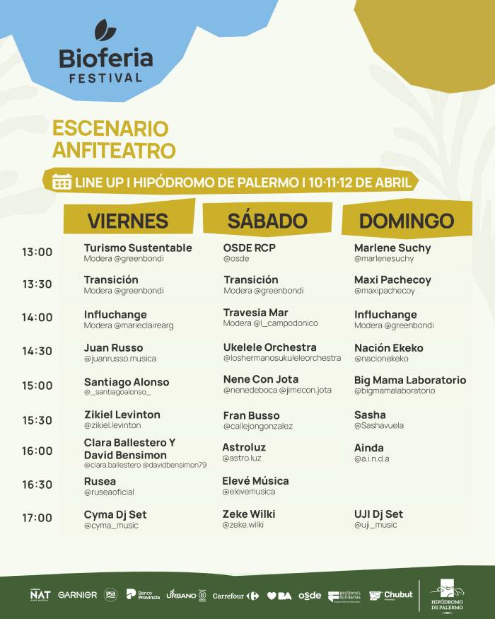 - Escenario Anfiteatro: música en vivo con artistas como Ainda, Nación Ekeko y DJs